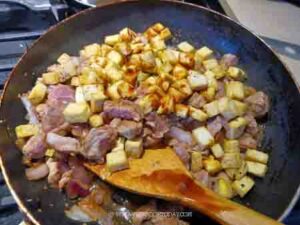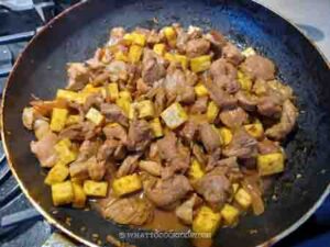 Add the diced chicken/pork and cook until they turn opaque. Add the fried tofu pieces. Add the seasonings, except for the sesame oil and hard-boiled eggs (which I forgot here in the step-by-step photo LOL).