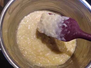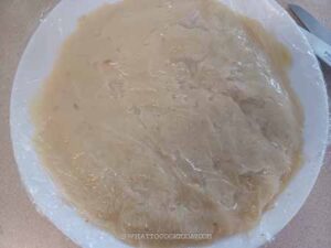 Let the mixture cool down at room temperature for about 30 minutes, stirring every now and then. Cover with a cling wrap, touching the surface of the coconut pastry cream directly to prevent skin from forming. Put this in the fridge and let it chill in the fridge for at least 4 hours, preferably overnight. It can be kept for up to 3 days in the fridge