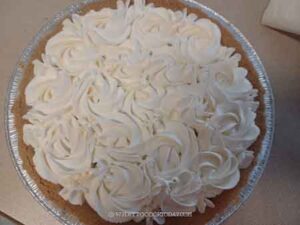 Cut the pie into desired size and sprinkle with toasted coconut. If you decorate the pie with toasted coconut, the coconut will turn soft and soggy. So it is best to just sprinkle it on the pie just before serving for that contrast of texture