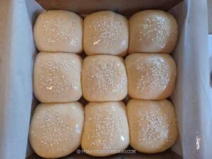 10 minutes before the end of the second proofing, preheat your oven to 375 F (190C) for a conventional oven. For a convection oven, reduce baking temperature by 20 F or 15 C. Brush the proofed buns with egg wash and then sprinkle with white sesame seeds if you want or leave them out
