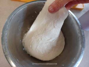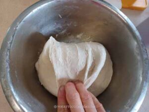 After 30 minutes, perform the first stretch and fold. Lightly wet your fingers, scoop and grab the edge of the dough from the bottom and gently wiggle it up to stretch it as far as it allows you to (don't force it and tear the dough).
