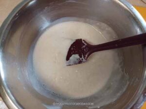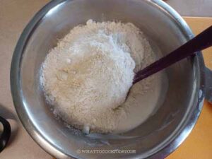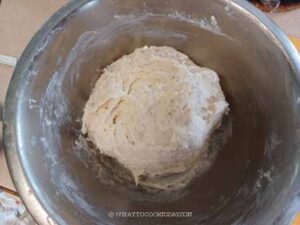 Use a sturdy spatula (don't use your hands) to stir to mix until you get a mass of dough that is more sticky to the touch than usual. If the dough feels dry and won't come together, add more milk, 1 tablespoon at a time. The dough should feel sticky and moist, but it shouldn't be soupy wet. Cover and let the dough rest for 30 minutes