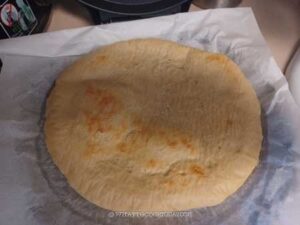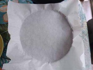 Because I plan to cook this pizza using the Ambiano electric pizza grill, I take one large parchment paper and put it inside the griddle to give me an idea on how large I need to roll the dough out