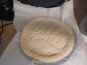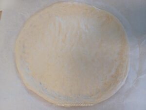 Dust the parchment paper with some flour. Place the dough on top of the parchment paper. Starting from the center, flatten the dough with your palms and stretch the dough out into about 12-inch round or use a rolling pin (dust with some flour), with the edge a bit puffier to create a border. If the dough is resistant and keep pulling back, cover with a cling wrap and give it a 5-10 minute rest and then stretch it out again
