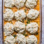 Put the dish in the middle rack and bake for 30-35 minutes or until the dumplings are cooked through and the sauce is bubbly. If you insert a toothpick into the dumplings, it should come out clean. The dumplings won't color much, with some spots with crisp edges