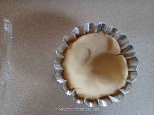 Use your thumb to make a deep indentation on the dough and press the dough onto the base of the mold and then spread it out with your thumbs to cover the side of the mold.