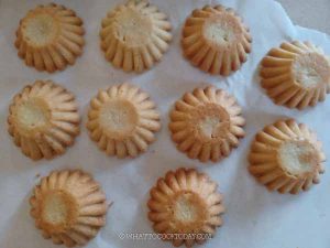 Gently flip the tins upside down on the paper. Give the bottom of the tin a few taps and the cookie will flip right out. A few may not flip right out. Usually I just wait a few more minutes and try again and they usually flip right out. Continue with the rest. Let them cool down upside down on top of the paper