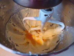 Add room temperature egg, vanilla, and almond extract and beat over medium speed until combined.