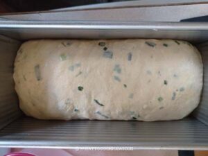 Transfer the dough to the prepared loaf pan. Cover with a cling wrap (I sprayed with non-stick spray to prevent sticking) and place at a warm place again to let it ferment until the dough is level with the rim of the pan if you are using USA pan small Pullman pan, or about 1 inch above the rim if you are using 9 x 5 loaf pan, about 45 minutes to 1 hour, depending on temperature