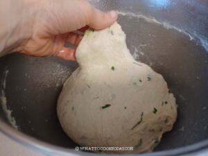 Put the mashed potatoes and the rest of the ingredients for the dough in a mixing bowl of a standmixer. Use the hook attachment to stir the mixture so the flour won't fly all over when you start the machine