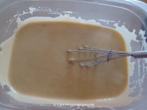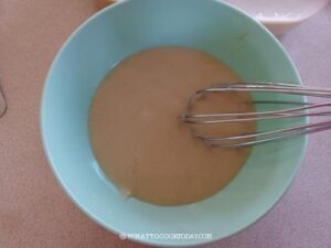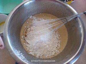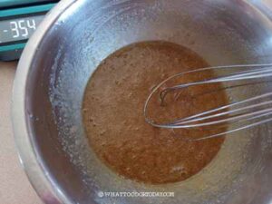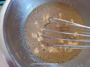 Whisk vigorously to combine. We do this so that the consistency of the oil is similar to your fluffy cake batter so they mix much easier