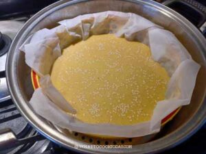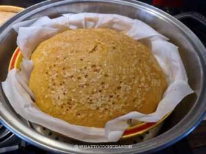 Steam on high heat for 45 minutes if using 8-inch round bamboo steamer and about 35-40 minutes if using 9-inch. If using metal cake pan, add another 5 minutes or so.