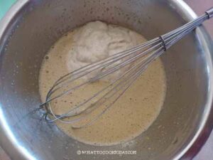 Whisk oil, baking soda and baking powder in a bowl. Use a whisk to gently stir the cake batter after proofing. Scoop about 4 tablespoons of the cake batter into the oil mixture