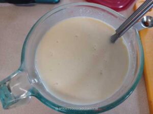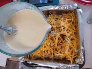 In a large bowl or large measuring cups, whisk together eggs, milk, salt, and Worcestershire sauce.