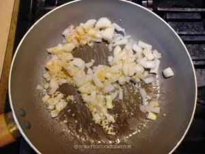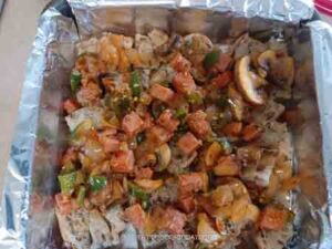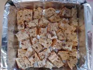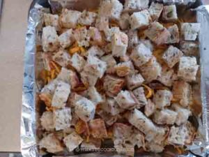 Grease a 8 x 8 inch baking dish. I use a metal pan here because that was the pan available to me when I made this dish. I lined with aluminum foil and grease with some oil (for easier removal and to avoid scratching the metal pan when I serving the strata). If you use glass or ceramic dish, this is not necessary