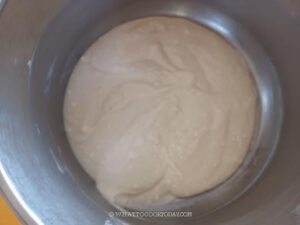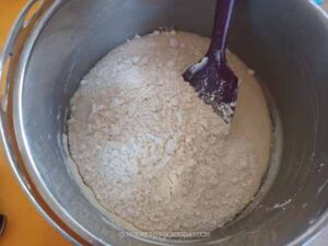 Add the flour and use a spatula to gently fold the flour into the wet mixture.