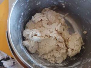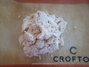 Then use your hands to give it a gentle knead, like 3-4 times, just enough to bring it together. You will get a ragged dough that is sticky. If the dough seems dry, drizzle 1 tablespoon of milk and mix again.