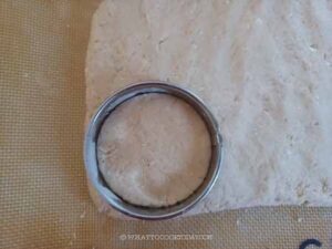 Dip a 2-inch or 2 1/2-inch sharp round cutter into a flour and press it straight down into the dough and DO NOT twist the cutter. Lift the cutter straight up. When you twist, the sharp edge of the cutter presses the dough down and kind of “seals” the sides. This prevents the biscuits from rising evenly and as tall as they could during baking. Cut out as many as you can and as close as you can
