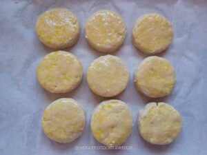 Place the baking pan on the middle rack and bake for 15 minutes if you use 2 1/2 inch cutter, and about 18 minutes if you use 3-inch cutter or until golden brown. If it gets too dark, you can tent with an aluminum foil (shiny side up) halfway through baking