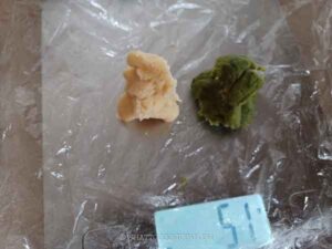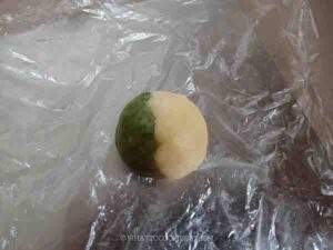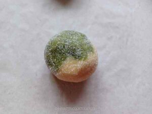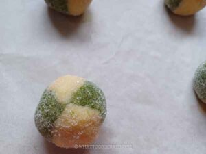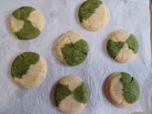 The total weight of dough for each cookie I made is about 50 grams (about a bit less than 1/4 cup). So you can get 25 grams of matcha dough and 25 grams of white chocolate dough. Roll each into a ball and "attach" them together and smooth into a dough ball