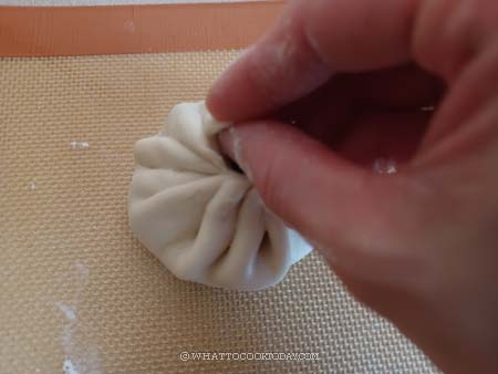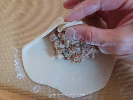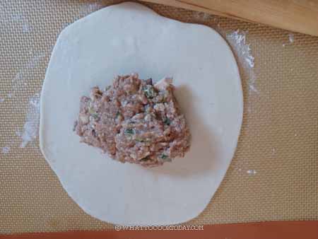- Put one portion of the meat filling and put it on the center of the wrap. Fold the edges to create a pleat to close the wrap while pushing the filling down with your thumb. Take care not to let the filling touch the edge of the dough because the dough gets slippery and it's hard to pinch it to seal. Pinch the dough seal to shut. If you don't know how to pleat the wrapper, simply gather the edge towards the center and pinch it to seal it. Place it seam side down and flatten the dough slightly with your palm. Repeat with the rest of the dough and the filling