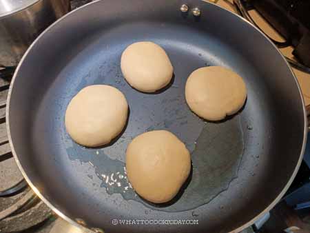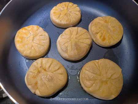 - Preheat a large pan with oil. When the oil is hot, arrange the pies on the hot pan. Try not to overcrowd and cook in batches if necessary. Let them cook for about 3 minutes on one side over medium-high heat. Then flip to the other side, cover and cook for another 3 minutes over medium-high heat. Then turn down the heat to low and cook for another 5 minutes on each side to ensure the meat filling is cooked through. The crust should have nice golden brown color