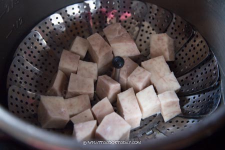 1. Peel taro and cut into smaller chunks or thin slices and steam on high heat until you can easily poke them with a fork, about 15 minutes. I pressure cook on high for 3 minutes