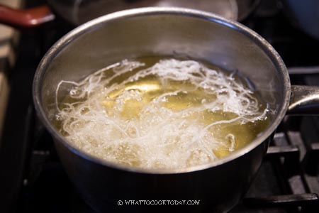 12. Carefully put in the dried rice noodles and they will puff up almost immediately