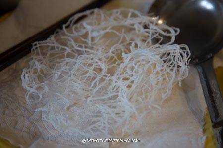 - When you dip a chopstick or skewer into the oil, if the oil bubbles around it, the oil is ready. Carefully put in the dried rice noodles and they will puff up almost immediately. Fry until they are crispy and place on an absorbent paper towel