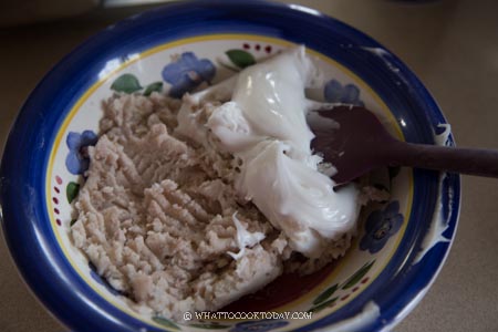 4. Mix wheat starch with hot boiling water (make sure it’s really boiling hot). This will precook the starch. Stir this into the taro mixture followed by shortening.