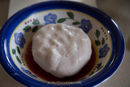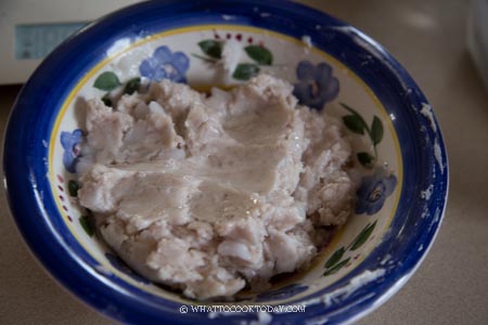 - Mix wheat starch with hot boiling water (make sure it's really boiling hot). This will precook the starch. Stir this into the taro mixture followed by shortening. Knead into a dough. The dough will still be somewhat a bit sticky at this point. Continue to knead until the dough is smooth