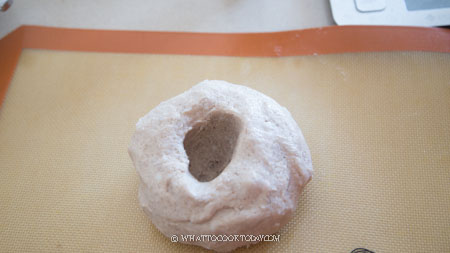 7. The dough should be soft and pliable now. Give it a few kneads. Gently shape the dough by making a hole in the middle of the dough and then gently shape into a ring