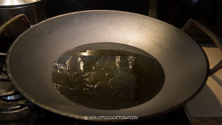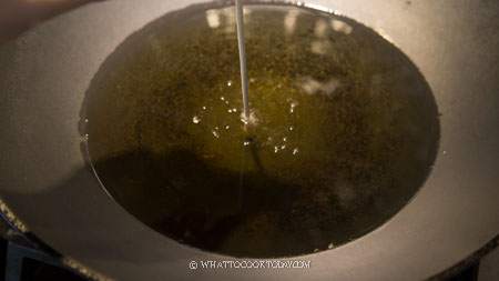 11. Let’s fry the rice noodle stick now (the photos below was taken at the different time when I made this). When you dip a chopstick or skewer, if the oil bubbles around it, the oil is ready