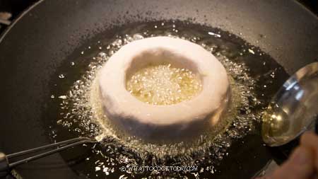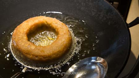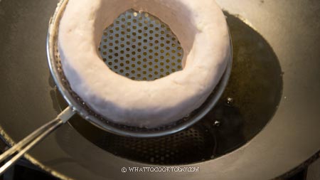 11. Gently lower the yam ring into the oil. Ideally you want the whole yam ring to be submerged in the oil, it makes your life easier actually (but I feel like that’s a lot of oil too). If the yam isn’t fully submerged into the oil, use a ladle to spoon the hot oil over the top of the basket all over so they brown evenly on the bottom and top of the basket.