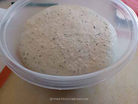 7. Place the dough in a lightly oiled bowl. This is optional but I like to put it in a round container, about 1 quart-size so I can monitor when it doubles in volume. Gently press the dough down so it’s flat and fill up the container. I will mark the side of the container with masking tape where the dough would double in volume. This may take about 30-45 minutes at around 79-82 F (26-28 C). It may be faster or take longer, depending on the temperature