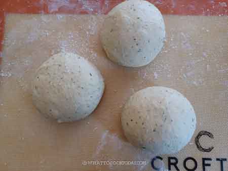 - Line a large baking sheet with parchment paper. Divide the dough into 6 equal-weight doughs. Round them up into a dough balls by pulling and tucking on the dough. Keep them covered and let them rest for 5 minutes