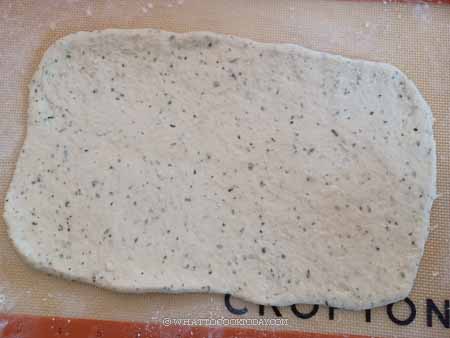 - Then work with one dough at a time and keep the rest covered. Flatten the dough with your palm and roll it into a rectangle shape, the width should about twice the width of the loaf pan and about the same length as the loaf pan. Fold the two sides over to meet in the middle and then roll the dough up, not too tight, not too loose, like a Swiss roll