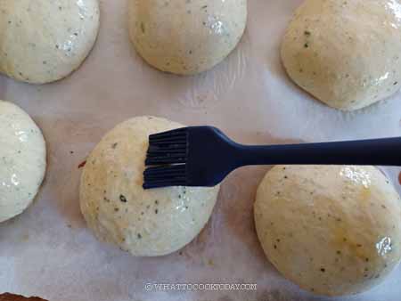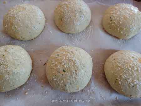 Whisk the egg with milk for an egg wash. Brush the surface with an egg wash. Sprinkle with parmesan cheese on top for hamburger buns and shredded cheese for bread loaf