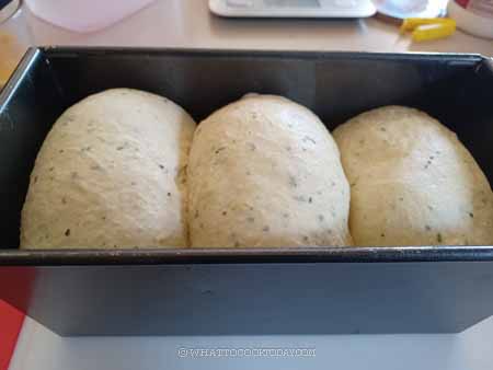 15. For bread loaf: Cover and let the dough proof again at a warm place until it fills up about 80-90% of the pan. This may take about 45 minutes to 1 hour or longer at 82 F (28 C). When gently poke on the dough, it bounces back gradually and leaves an indentation. The dough is done proofing