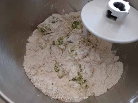 5. Stir the mixture with the dough hook to combine roughly so the dry ingredients won’t start flying when you turn on the machine.